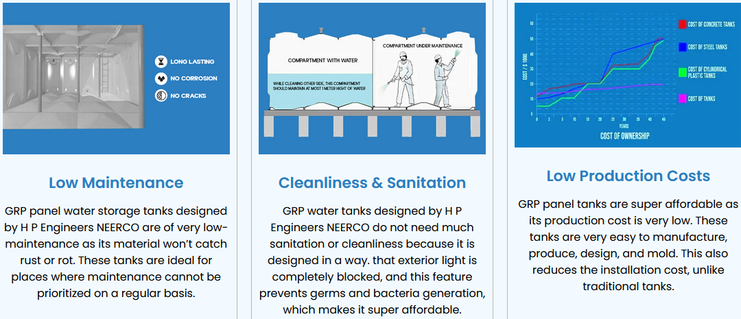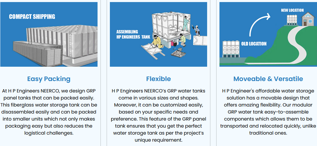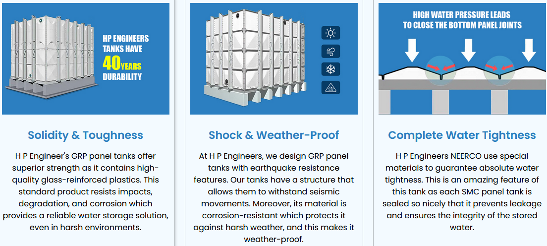 H P Engineer NEERCO SMC Panel tank keeps the stored water free from harmful contaminants and contributes to a cleaner environment by minimizing the need for replacements. Sleek and modular GRP water tank design ensures that they fit in any setting effortlessly, whether it’s for private or public use.