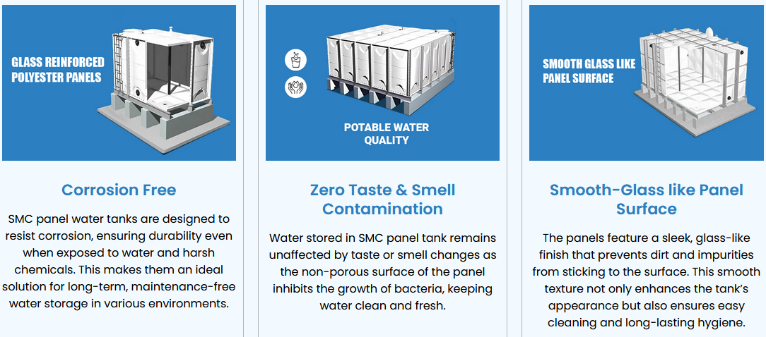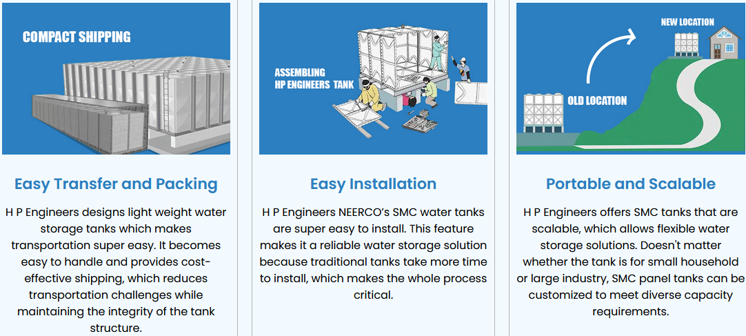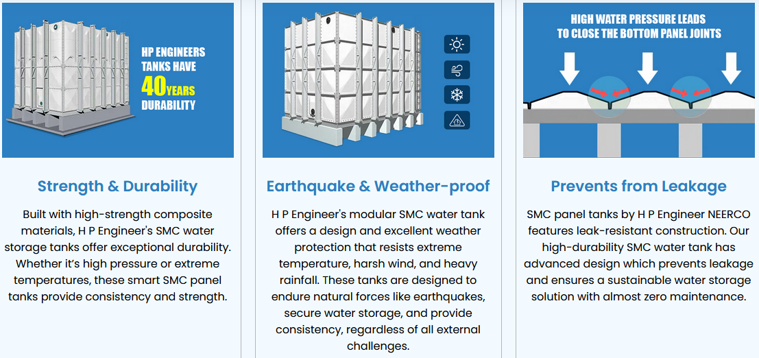 SMC stands for Sheet Moulding Compound and it has revolutionized the water storage solution. SMC Panel Water tanks designed by H P Engineer NEERCO, are very cost-effective, durable, and versatile. HP Engineers NEERCO are specialized in designing top-quality SMC panel water tanks for a range of applications like industrial, commercial, and residential. Unlike traditional water storage tanks, SMC water storage tanks are designed to face all the new-age challenges.