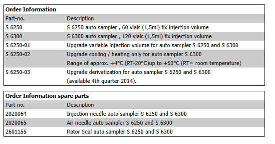 The modular nature of the S 6250 and S 6300 auto samplers offers the possibility to “just buy what you need”. Modular options include sample heating/cooling (only for auto sampler S 6300 in a range of approx. +4°C (RT-20°C) up to 60°C (RT = room temperature)) for any sensitive sample material and derivatization for automatized pre-column derivatization tasks from reagent derivatization to automatic sample dilution (available 4th quarter 2014).