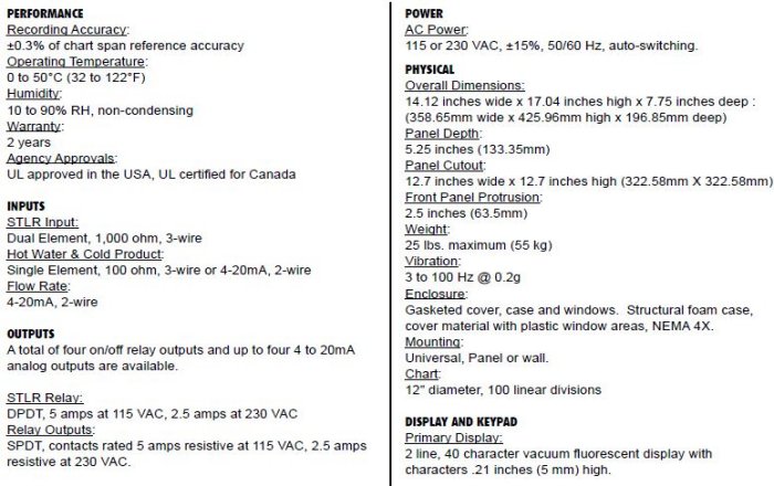 The standard unit provides legal Safety Thermal Limit Recorder (STLR) functionality with up to 5 selectable diversion setpoints. Remote selection of these setpoints is available as an option. Product temperature is monitored via our time proven dual element, 1,000 ohm RTD sensor. The STLR monitors sensor balance between the two elements to insure failsafe operation. The hot product scale, temperature, and flow diversion valve frequency trend are printed in red. When configured for multiple divert, the activated setpoint temperature is continuously printed in green.