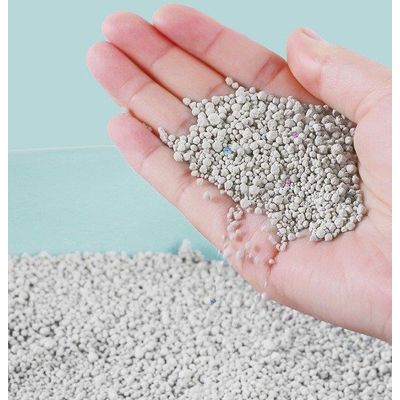 Bentonite Pet Litter Super Absorbent, 100% eliminates all odors. Environment friendly, you can place waste of pet litter in a compost pot, and later can use it as a natural fertilizer for your plant. You can fill up the cat’s litter tray 5-7 cm, easy to remove litter and refill when required. 99% dust-free bentonite, and No footprints. Color: Grayish white, can add pink and blue beads