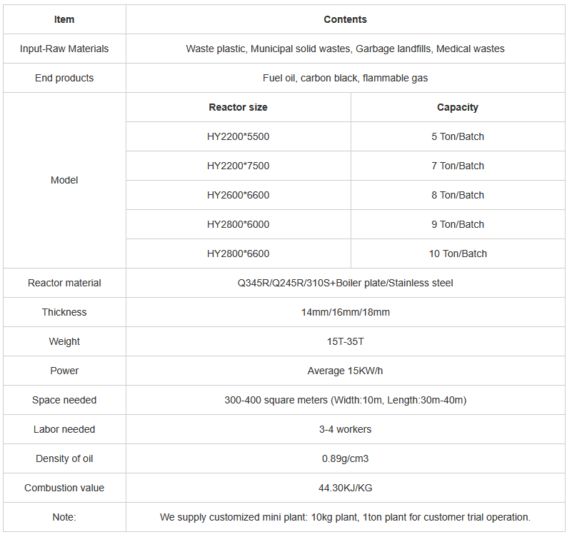 - Input material: Waste plastic, Municipal solid wastes, Garbage landfills, Medical wastes.