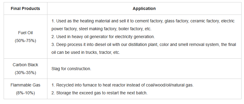 - Output products: Fuel oil, carbon black, flammable gas.