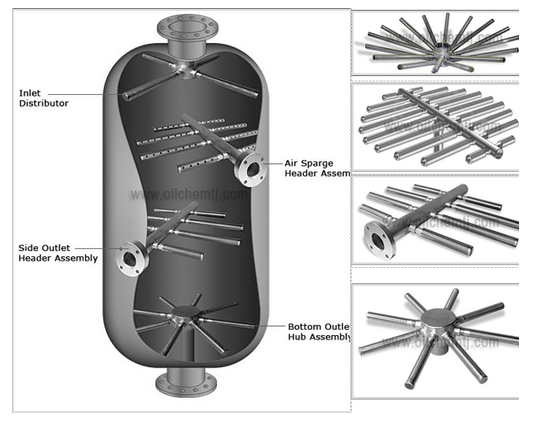 Hub Laterals can be designed for disc head vessels enabling the system to collect completely to the bottom of the vessel. Header Laterals design are also available for flat bottom vessel distributor or collector applications. Systems can be designed to accommodate side, center, top or bottom inlet piping. Integral backwash systems can be designed for any hub and header lateral for fast effective and efficient cleaning. Connections of the laterals can be flanged or threaded. All systems are designed for effective liquid or solid retention in a wide range of applications including exchangers, clay and sand filtration applications, carbon towers and power plants with water systems.