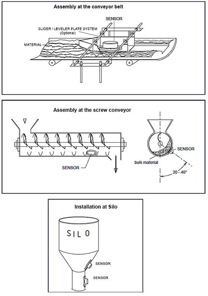 - Installation locations include: conveyor belts, screw conveyors, silos, funnels, etc.