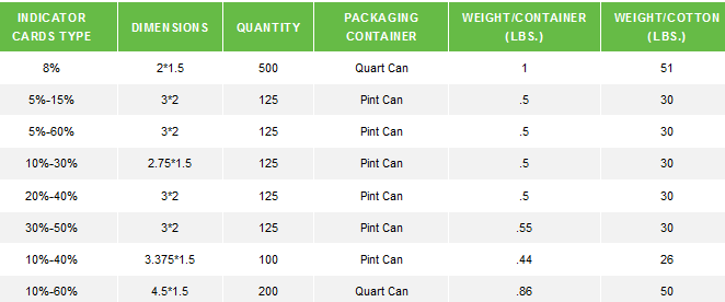 The changing color will help you to indicate the percentage of humidity present in the packaging. Humidity can be measured from 5% to 60%, complies with MS 20003-2. These cards are reversible.