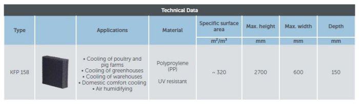 HUMIPACKING fills are used to cool animal sheds and green houses. They feature excellent cooling performances at low pressure loss. Their material - a polypropylene compound - makes them very rugged and long-lasting. As they are easy to clean, they do not have to be exchanged regularly, which is a big advantage compared to other products on the market.