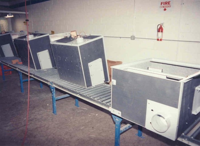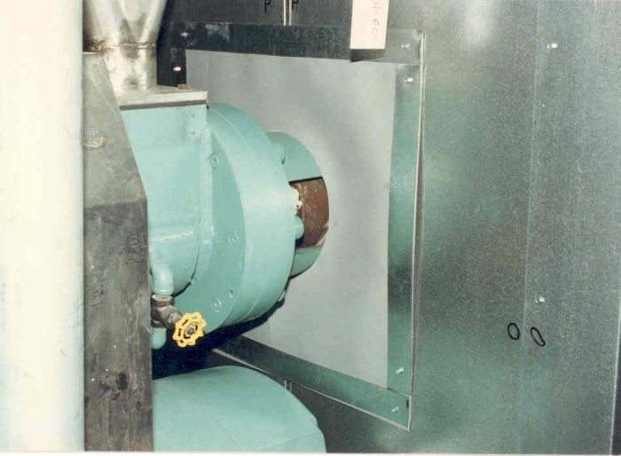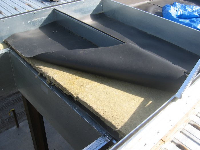 A built-up system using alternating layes of HUSH BLOCK loaded vinyl applied to the inside of a rooftop unit curb will reduce radiated noise from the bottom of the unit which can transmit down through the roof deck and leak down around the supply and return duct openings. The roof decking should be flashed to within 1/2" of duct walls before application of HUSH SEALANT acoustical grade caulk. The above picture and top left detail illustrate this application. If the roof curb is a plenum exposed to the airstream, HUSH FLEX Class A composite material ABAC-111N should be used in a similar double layer configuration.
