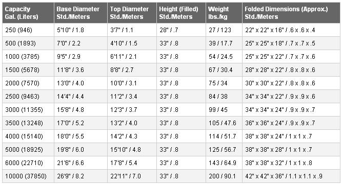 Vinyl Self Supporting water tanks come standard with a durable 30 oz. floor. In addition to standard vinyl, they are also available in NSF 61 approved 30 oz. potable material and in chemical and fuel resistant materials that are great for oil spill clean-up or petroleum storage.