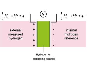 If the voltage across the ceramic is known and the hydrogen concentration on one side is known (the “reference” hydrogen concentration), then the hydrogen concentration on the other side can be calculated. This type of arrangement is called a “hydrogen concentration cell”.