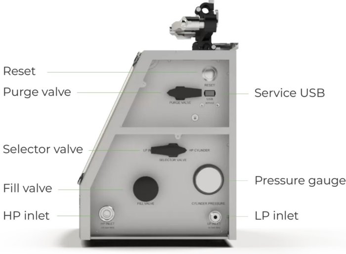 - Refillable gas bottle (300ml): Dry argon or nitrogen. Max fill pressure: 120 bar