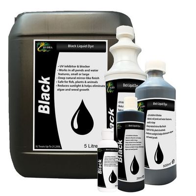 Hydra Black Liquid Dye provides an impressive reflection to your pond and/or water feature and has been used by the likes of landscape gardeners, garden pond/water feature keepers, local authorities, golf courses, and farm ponds. We have also known our dyes to be added in small amounts, to glass vases and centrepieces for weddings and other events, to create more drama and atheistically appealing looks.