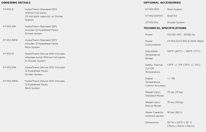 HydraTherm Hot Pack Heating Units for moist heat therapy feature composite polymer tanks that never rust, and are easy to maintain, needing to be cleaned only once every six months.