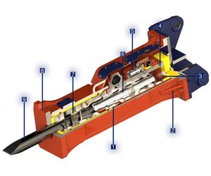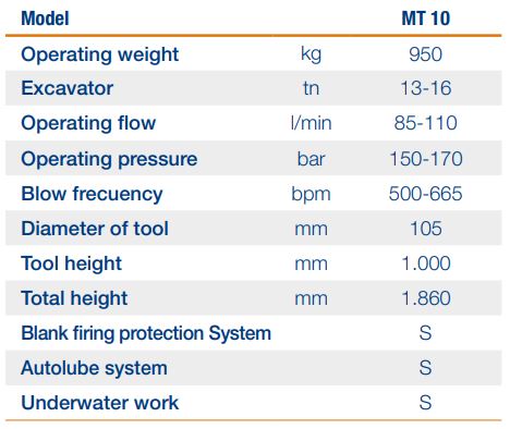 Model: MT10. Operating weight: Kg 950. Total length: mm 1.860. Working pressure: bar 150-170. Working flow: L/min 85-110. Blow frequency: bpm 500-665. Diameter of tool: mm 105. Length of tool: mm 1.000. Excavator: Tn 13-16.