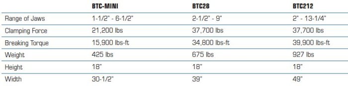 The redesigned lightweight and compact BTC Series Hydraulic Breakout Wrenches allows for hands-free operation of pipe joint breaking from the safety of the operator’s console and eliminates the need for manual tongs. Outstanding breakout torque and clamping force for faster pipe change-outs. Hardened vee-groove jaw inserts provide a full, secure grip on the pipe, increasing the service life of jaw inserts and drill pipe tool joints. An open ‘C’ shape design permits the operator to drive the rig off the drill pipe without having to push through the table. The distance between clamp tables is more compact, clamp holders receive hardened jaw inserts which are more durable and have a very low replacement cost. Jaw inserts can be installed and removed without the need of tools. Construction of rotation turret uses fewer moving parts. Easy retrofits to any drill rig. Different size adapter brackets available to accommodate any spindle to mast distance.