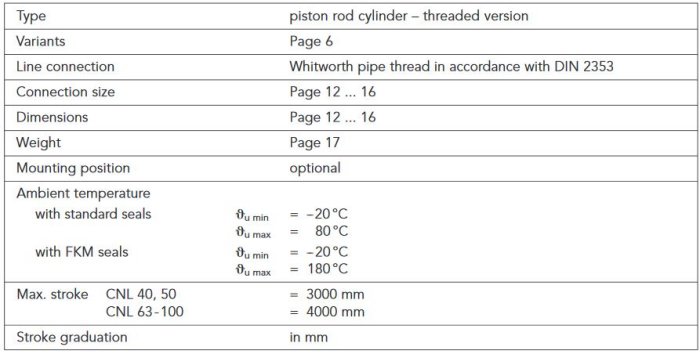 Hydraulic cylinders of the type series CNL are designed as a pure bolted construction. Cylinder heads and base consist of St 52-3. For the cylinder tubes, "seamless precision steel tubes", in accordance with DIN 2391, are used and a high-strength steel is used for the milled, polished and hard-chromium-plated piston rods. The piston and piston rod are sealed with compact seals. According to service conditions, the cylinder can be equipped completely with FKM seals.