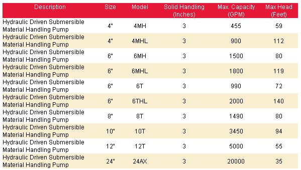 Griffin’s Hydraulic Driven Submersible Pumps are available in trash, axial flow and materials handling models. The pumps range from 4” to 24” with a variety of impeller designs. These pumps are designed for handling high volumes of water up to 20,000 gpm and head conditions up to 140 ft. The impellers can handle solids up to 3”. Some models may also be used for high pressure applications.