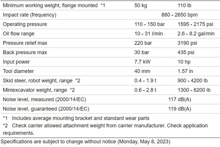 Rammer E01 is the smallest compact model hydraulic hammer, suited for carriers in the 0.4 to 2.8 tonne range. Despite the small size, E01 packs the power of Rammer so you can enjoy piece of mind and smooth flow of operations in various applications. Featuring CBE operating principle and membrane accumulator, E01 is easy to maintain and install to different carriers. Compact, right size for the job ensures higher productivity and optimized fuel consumption. Modular body design structure enables versatile use through the whole lifecycle, and optional features including wear plates for cast body protection, RD3 and automatic greasing device further enhance durability.