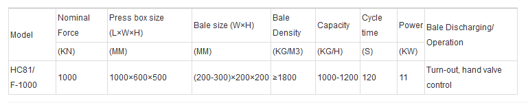 The HC81F-1000 metal recycling baler is suitable for cold pressing metal scraps like waste bits, scrap steel, waste oil tank and disassembled vehicle etc. Normally, the thickness is less than 3mm. This baling press works with high speed and automatically controlled by PLC.