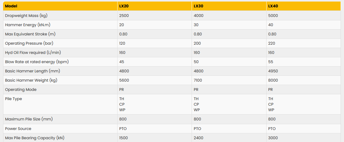 The LX hydraulic hammer range of powerful yet lightweight hammers have been designed to provide greater stability to piling rigs. The LX hammers provide an economical solution for the installation of all types of piles. The four hammers, LX30, LX40, LX50 and LX60 in the range are capable of driving steel, concrete or timber piles in a variety of soil conditions. Drop-weights extend from 2.5t up to 7t while impact energy ranges from 20kNm up to 55kNm.