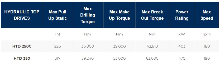 Our hydraulic top drive series are designed to deliver high performance, can be fitted to almost any mast design available. It has the following features: Maximum speed range of between 180 rpm to 190 rpm. Power rating range of between 403 kW (5340 hp) to 470 kW (630 hp). Maximum drilling torque range of between 36,000 Nm (28,765 lb/sqft) to 53,000 Nm (39,090 lb/sqft). Maximum pull up static load of 226 mt (500,000 lbs) to 317 mt (700,000 lbs).