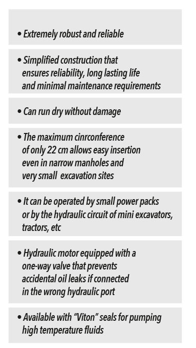 SP20 is a compact and powerful immersion pump designed for handling trash, muddy waters and for heavy fluids in general.Compact and light provides a flow rate up to 800 L/min and maximum water head of 35 meters. Can pump solid particles with dimensions up to 3 cm. It can run dry without damage. Compact and safe, the SP20 is ideal for emergency services, for the maintenance of urban gas and water networks, the field operators can work with their feet immersed in the same water in which the pump is operating.