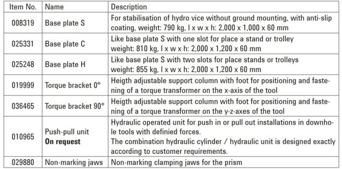 The hydraulic vice have been designed for short-term clamping of downhole tools or other cylindrical workpieces. The 3-point clamping is carried out via a manual spindle and a hydraulically operated prism. The spindle is turned down to the diameter of the workpiece. Then the required clamping force is generated by the hydraulic lifting of the prism. The prism is equipped with specially textured jaws that effectively prevent the workpiece from rotating.