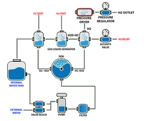 Deionised or distilled water is pumped into a Polymer Electrolyte Membrane (PEM) cell. Within the PEM cell Electrolytic Disassociation splits the water into Hydrogen and Oxygen. The Oxygen is vented safely from the system whilst the Hydrogen proceeds through the system. After passing through a gas/liquid separator the hydrogen gas enters a double column regenerative dryer to remove the last traces of water from the gas. The hydrogen then passes to the application via a pressure regulator.