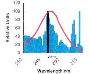 The figure on the left shows the UV spectrum of a low pressure UV lamp (black column) versus a medium pressure UV lamp (the blue columns!). The red line is the DNA absorption curve.