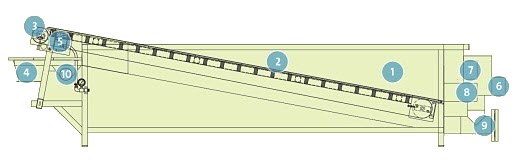 Sludge or wastewater is led into the filter (1) and passes by gravity through the filter belt (2). The belt is designed as a slowly moving conveyer installed in a stainless steel tank. As the water passes through the filter, the filtering process ensures the efficient removal of particles. These particles are drained on the belt to a high dry matter content. The dewatered sludge is removed at the top of the filter (3) and discharged through a hopper (4) for final treatment. Dewatered sludge is scraped off the belt which is cleaned by a high-pressure backwash system* (5) and the rinse water is led either back to the process or to further treatment. (*Backwash unit retracted for visibility.)