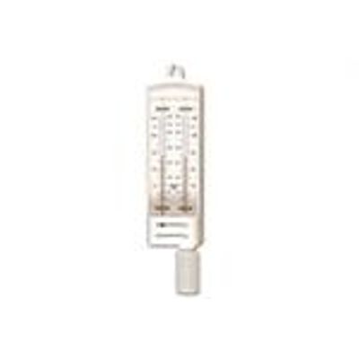 The classic masons hygrometer with wet and dry bulb hygrometer and a large water reservoir. One thermometer bulb is in air and the other is wrapped in a wick kept moist from a water reservoir. The difference between the two readings is used to give an accurate calculation of humidity. Complete with wet and dry bulb tables. C & F.