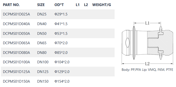 Material: lip (VMQ, FKM, EPDM) body (PP, PFA)