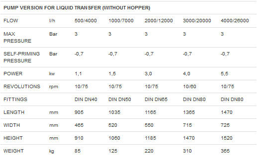 Rotor speed is regulated by an electronic variator (inverter). It has a pressure switch of safety on pump key turn in order to stop automatically in case of problems related to overpressures. It has N.2 buffer tanks in order to soften pressure impulses on the pipes linked to the pump. This pump is properly suitable for fluids, food fluids and fluids with suspended solids or semisolid products handling (musts, wines, whole grapes, destemmed and crushed grapes, fermented pomaces, fruit juices, divided fruit, honey, yogurt, paints, etc.). The pump version for semisolid products transfer and pumping is equipped with a motorized loading hopper and a suitable anti-hardship grill. The loading hopper is easily linked to the pump body through a fast DIN fitting and a plug for electrical connection.
