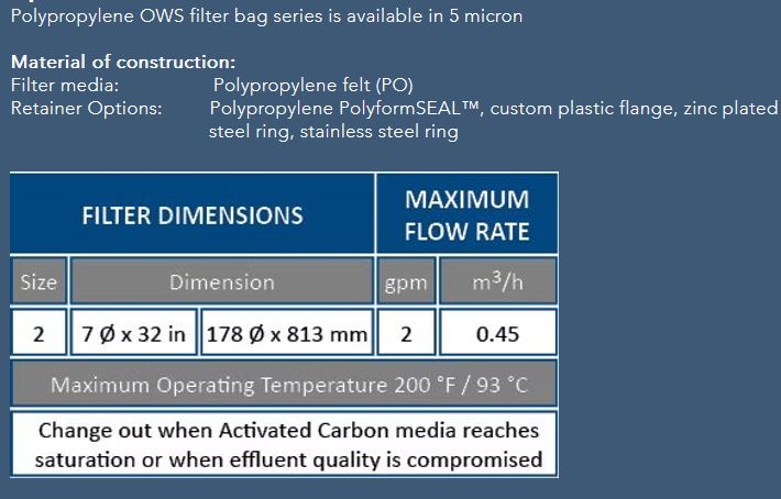 For maximum retrieval of trace amounts of oil, the OWS Activated Carbon filter bag offers the best holding capacity of all the oil-adsorbing filter bags.
