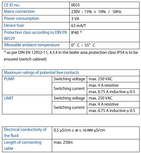 The DCU water level controller works in conjunction with the Igema level probes on the basis of the conductive fill level method of measurement whereby the electric conductivity of the water medium is used. The conductivity of the medium is measured in µS/cm. For the secure functioning of this method of measurement a minimum conductivity of the substance to be measured is required.