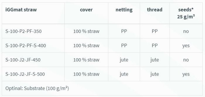 There are different types of the classic erosion control blanket made of straw in the iGGmat straw product series. They all have a layer of 100 % straw and are stitched either on one or both sides with a backing made of PP-netting or jute fabric, as well as a PP- or jute-fiber. All iGGmat straw products can also be supplied as seeded blankets. In this case a carrying paper with seeds is stitched to the straw layer. iGGmat straw is used on areas at risk of erosion with up to 10° slope (1:5.7) for temporary erosion control. The lifetime of the iGGmat straw is up to 12 months. It depends on the conditions of the location, the soil, water and climatic conditions as well as the risk of erosion on-site. iGGmat straw products are up to 100 % biodegradable.