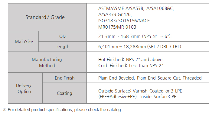 ILJIN Steel manufactures a wide range of line pipes for onshore and offshore applications. Line pipe is available in sizes ranging from NPS 1" to 6" and can be produced by seamless manufacturing method following API 5L, EN and DNV standards. Pipes are inspected for internal and external defects using ultrasonic and electromagnetic inspection equipment. Pipes are automatically packed in bundles and tied with steel banding or wires in compliance with API loading and transportation standards.