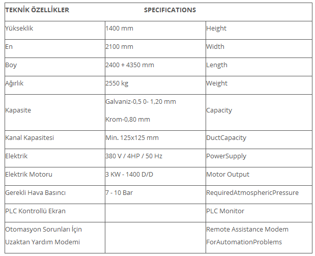 - Duct Forming Machine makes min 12,5 x 12,5 cm and max 500 x 500 cm duct.