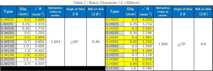 SELFOC Imaging Lenses are specified somewhat differently than SELFOC Micro Lenses (SML). While SML performance is controlled through the lens pitch and gradient constant (√A), Imaging Lens performance is controlled via the working distance (WD) and image quality factors such as resolution and field curvature. For this reason, ILW and ILH lenses can consistently exhibit good image quality despite variations in √A and/or Z (Lens Length).