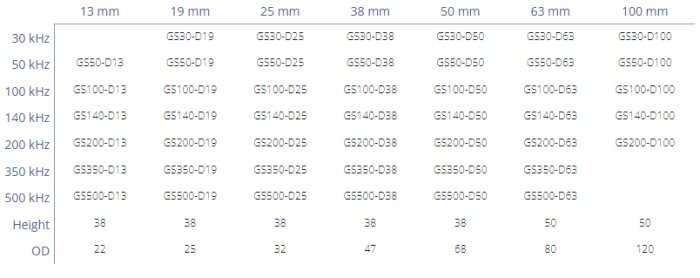 Low frequency transducers with Ultran proprietary gas matrix piezocomposite (GMP™) for high sensitivity and bandwidth. Designed for use in water and other non-corrosive liquids. All units built standard with top mount UHF connectors. Models 25 mm and lower constructed with stainless steel housing; 38 mm and higher constructed with PEEK housing.