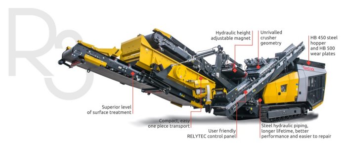 R3 Impact Crusher its ground breaking design won the prestigious Red Dot Design Award, the German Design Price and the Big See Award because of innovative technology, like the zero-emission plug-in electric drive system, high sustainability, high safety standards and the powerful and functional design which makes this compact impactor a winner in its class.