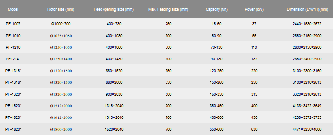 Impact crushers can crush various coarse and medium materials with a particle size of not more than 200-700mm and a compressive strength of not more than 350MPa, such as limestone, concrete, dolomite, construction waste, etc. The size of the discharge granularity can be adjusted, and the crushing specifications are diversified.