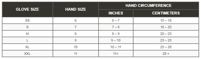 Proper size is important. Follow the guidelines below to determine your correct glove size. To determine glove size, with fingers extended measure circumference of the hand across the knuckles at the base of your fingers (don’t include the thumb).