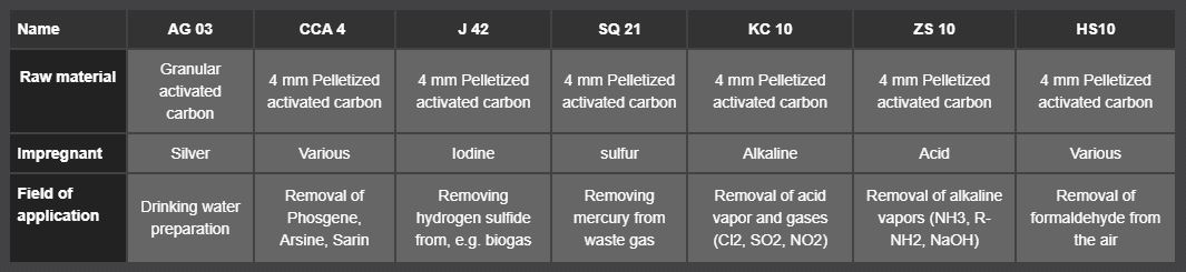 Impregnated activated carbons are mainly used for air cleaning. Standard activated carbons excellently adsorb volatile hydrocarbons. In case toxic substances such as hydrogen sulfide, mercaptane and ammonia are present, a specially impregnated activated carbon is required. The impregnation in combination with the carbon surface removes these substances by neutralizing or reacting with them and store them onto the inner surface of the carbon. Only silver impregnated activated carbons are used in water treatment. The silver is bacteriogen.