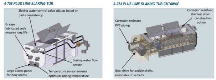- Superior Paste-Slaking Process : Utilizing a low water-to-lime rate (2:1), the A-758 Plus unit slakes lime as a paste which provides a number of benefits over the more traditional 4:1 or slurry slaking process. This includes lower power consumption, faster slaking, a smaller footprint and, most importantly, a more reactive lime slurry solution. In addition, the A-758 Plus incorporates innovative controls to produce consistent and reliable paste concentrations.
