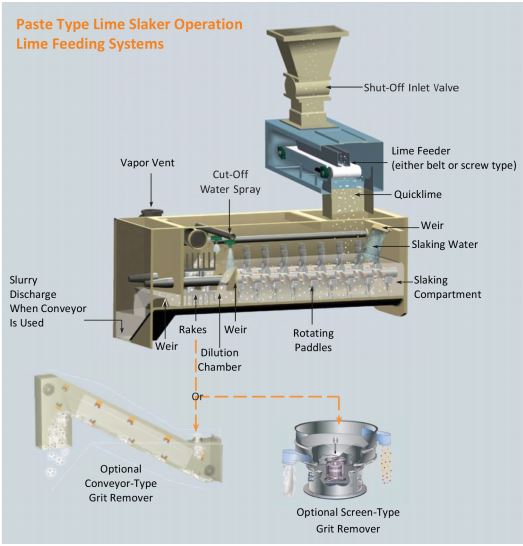 Water and quicklime (CaO) are fed into the slaker mixing compartment at an approximate 2:1 ratio. The lime is metered by either a gravimetric weigh belt feeder or a volumetric screw or belt-type feeder. Controlling the lime feedrate determines the output of the slaker system. The water flow is automatically controlled based on the desired paste concentration.