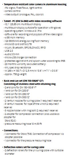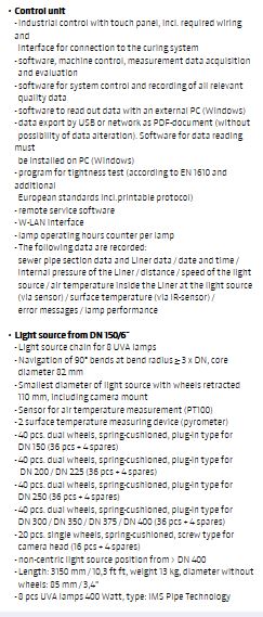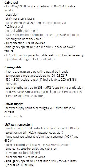 Cable reel: For 180 m/590 ft curing cable (max. 200 m/656 ft cable length possible). Extension arm with deflection roller to ensure minimum bending radius of the cable. All connections are hard-wired. Emergency operation via hand crank in case of power failure. PLC with control panel.