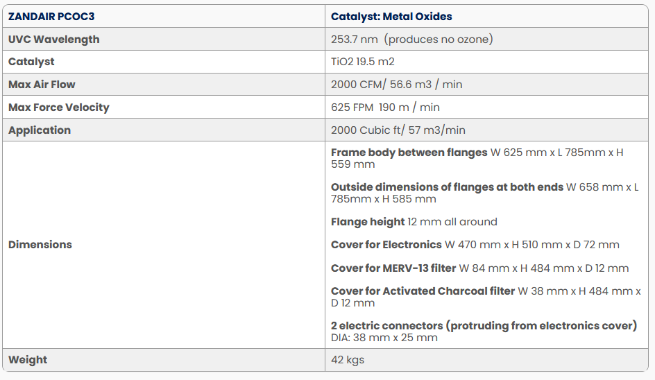 The ZANDAIR PCOC3 (Photocatalytic Oxidation Chamber) model is a powder-coated metal encased unit to be fitted into the HVAC/AHU unit or the air ducting to provide an airtight flow of the airstream through the unit. The PCOC3 may be installed into newly constructed HVAC/AHU systems or can be retrofitted into existing air filtration systems with HEPA filters in place. Available for in-duct installation or external rooftop installation.