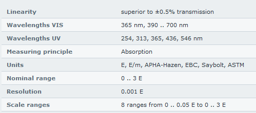 - Calibration in E/m, APHA-Hazen, EBC, ASTM, Saybolt, etc.