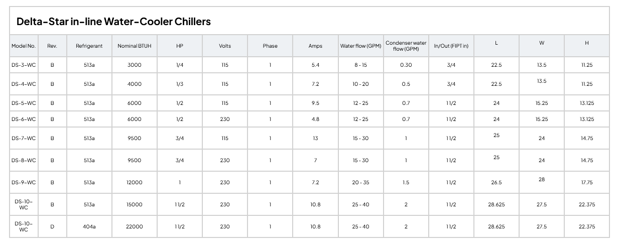 Delta Star in-line water-cooled chillers with low profile, compact design allows for easy placement in tight, confined spaces where restricted air flow may damage chiller. With a broad range of capacities available, they utilize an in-line custom heat exchanger barrel with a robust titanium helical coil for maximum heat transfer efficiency.